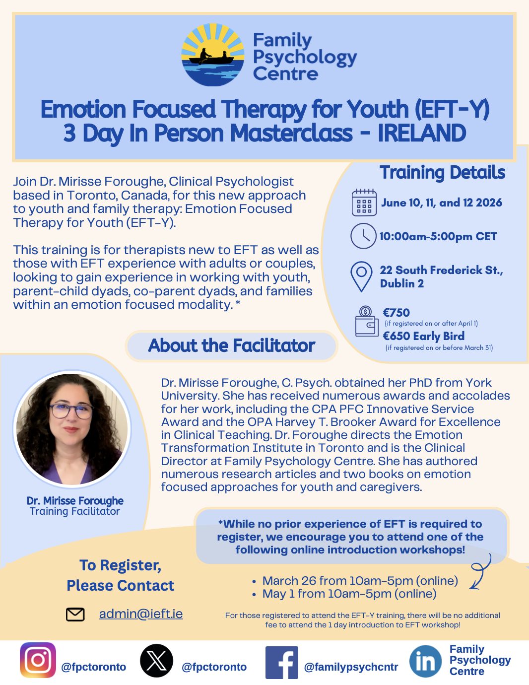 Join Dr. Mirisse Foroughe, C. Psych. for a 3 Day Emotion Focused Therapy for Youth (EFT-Y) In Person Masterclass In Ireland. Dr. Foroughe is the Director of the Emotion Transformation Institute and Clinical Director at the Family Psychology Centre. With extensive experience in clinical training and research, she has authored books and articles on emotion focused approaches for youth.