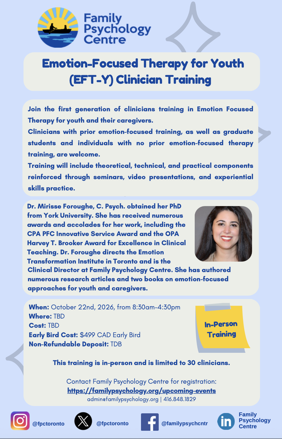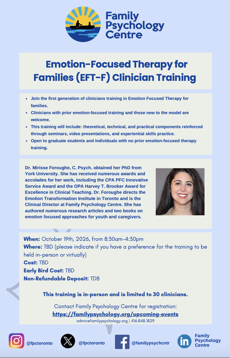 Join Dr. Mirisse Foroughe, C. Psych. for a training in Emotion Focused Therapy for Families (EFT-F).